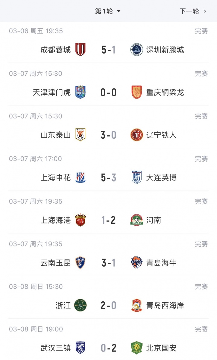 赛事直播-中超首轮积分榜:蓉城积3分居首,泰山负3分,津门虎负9分垫底 频道:西甲 日期:2026-03-13 浏览:53 03月08日讯 中超首轮全部比赛战罢,新赛季第一轮排名出炉。【相关新闻】官方:申花、津门虎被罚10分,海牛被罚7分;泰山、河南被罚6分积分榜:中超首轮赛果↓ 上一篇:世界赛比分-【英超】马丁内利双响S罗破门 阿森纳客场4-1利兹联 下一篇:S赛注册-火箭助教:恩比德骗犯规太疯狂了 他现在只想着进攻&要让申京突他 相关文章 赛事直播-德国乒协致信国际乒联,严厉批评伦敦世乒赛新赛制 S赛注册-火箭助教:恩比德骗犯规太疯狂了 他现在只想着进攻&要让申京突他 赛事直播-中超首轮积分榜:蓉城积3分居首,泰山负3分,津门虎负9分垫底 世界赛比分-【英超】马丁内利双响S罗破门 阿森纳客场4-1利兹联
